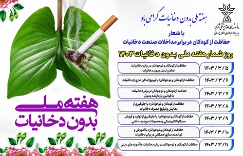 وی خاطرنشان کرد: همچنین پنجمین روز هفته ملی دخانیات چهارشنبه 9 خرداد با عنوان "حفاظت از کودکان و نوجوانان؛ با جلوگیری از تولید و فروش سیگار الکترونیکی ومحصولات نوپدید دخانی"، ششمین روز پنجشنبه 10 خرداد تحت عنوان "حفاظت از کودکان و نوجوانان؛ با آموزش وتوانمند سازی همگانی در برابر دخانیات" و آخرین روز این هفته جمعه 11 خرداد با عنوان “حفاظت از کودکان و نوجوانان در برابر دخانیات؛ با آموزه های دینی” گرامیداشته می شود.