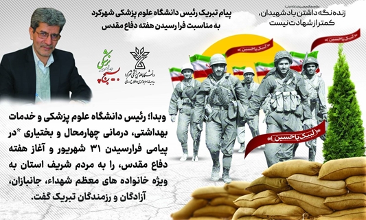 اینجانب با گرامیداشت یاد و خاطره رشادت ها و دلاور مردی‌های تمامی شهیدان گرانقدر، رزمندگان، ایثارگران، جانبازان و آزادگان؛ مراتب تهنیت و تبریک خویش را به مناسبت این ایام غرور آفرین ابراز نموده و از خداوند متعال سربلندی ایران اسلامی و توفیقات روز افزون مردم شریف استان به ویژه رزمندگان، ایثارگران، جانبازان و آزادگان دانشگاه علوم پزشکی استان را در پرتو منویات رهبر عظیم الشان انقلاب مسئلت می‌نمایم.